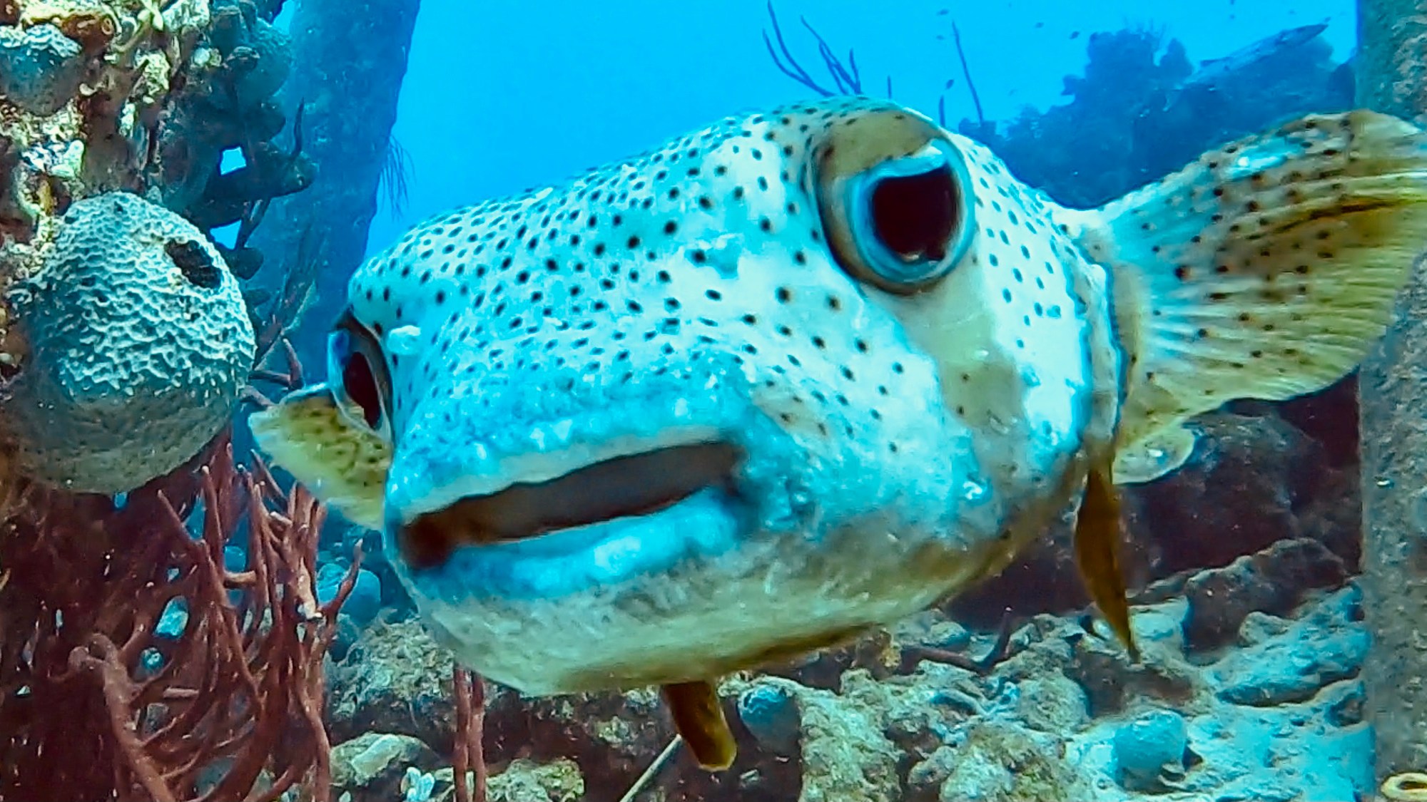 Still, it’s not all happy times. We’ve seen tragedy too. While diving Salt Pier, Patrice and I came upon a porcupinefish who didn’t swim away from us. It swam into us instead.