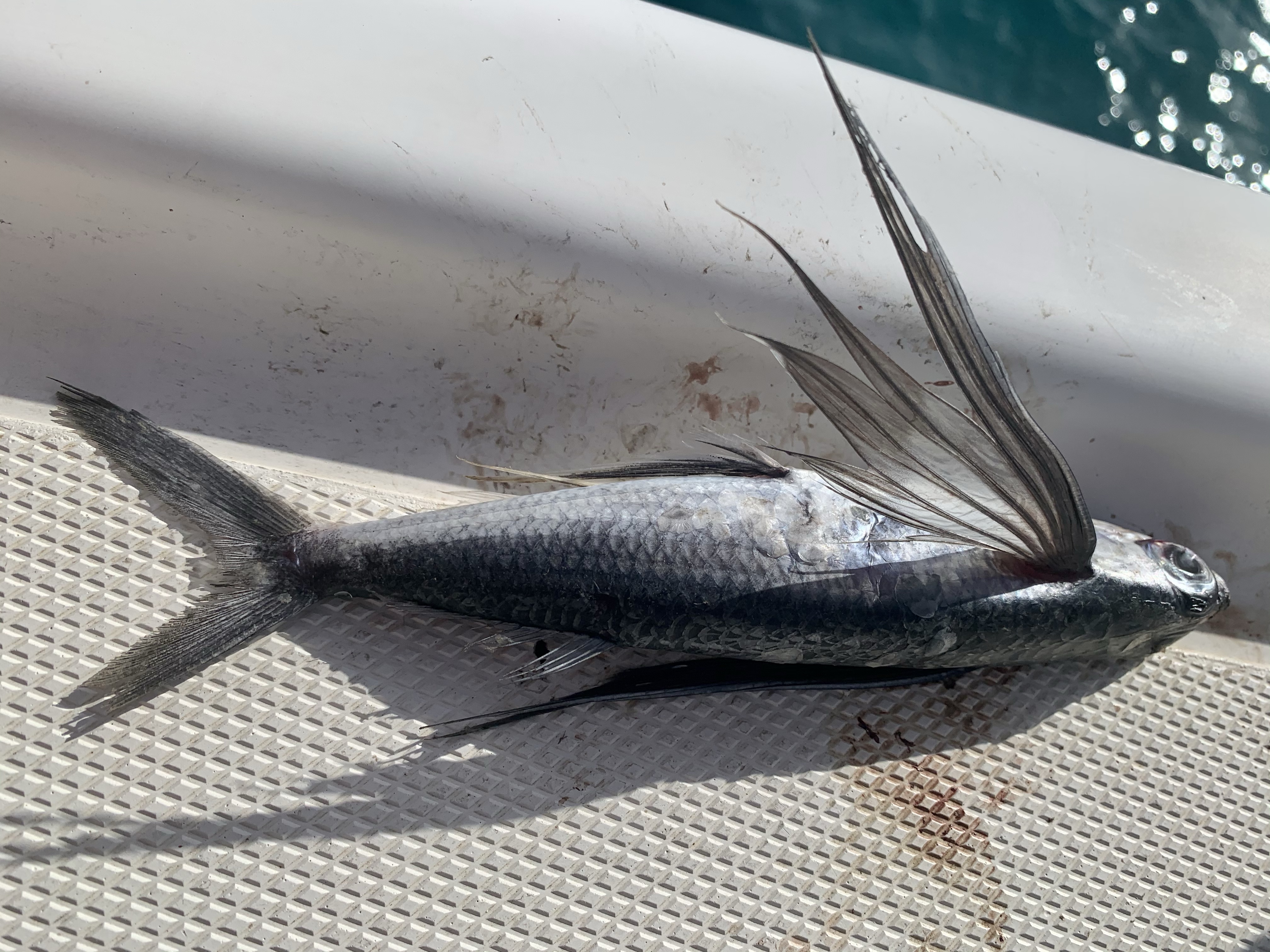 The flying fish crashed off onto Quest’s forward deck. By the strength of the thud, I don’t think it survived the ordeal. It’s late now. In the morning, we’ll know for sure. It may be lying stiff as a corpse. We found another flying fish in the dinghy the other morning having suffered the same fate. It’s ‘wings’ were folded up on its sides. Amazing how high these bird fish can fly – especially if something is chasing it. I’m glad the net was pulled tight, otherwise we would have had a fish flapping in the bedroom. Boat problems…