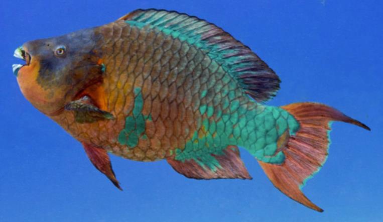 Rainbow parrotfish are the biggest parrotfish in the Caribbean. Stocky, with fleshy tails and humpy heads, this one was at least a metre long. They are mostly bi-coloured, starting with red and ending with green, with the red popping up again at the tail, Hold on. I’ll find a stock photo.
