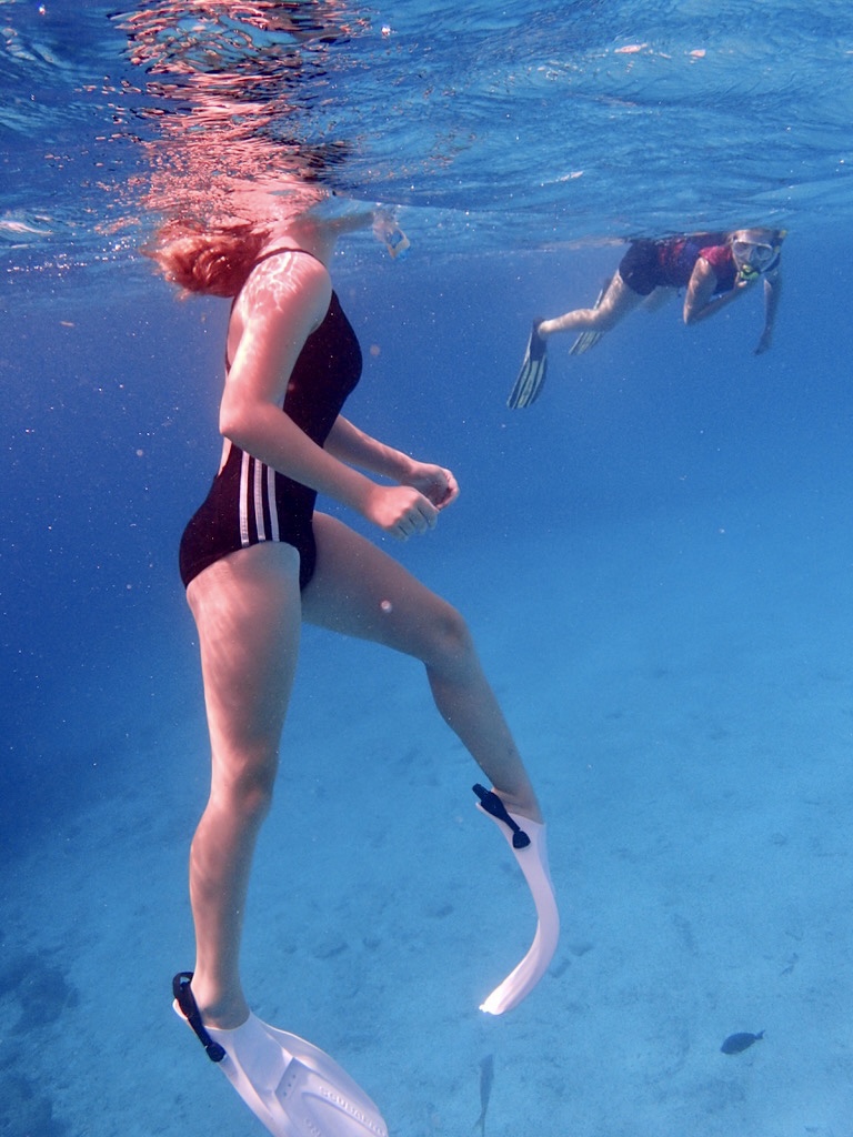 She can dive right under Quest’s 2.1 metre deep keel. Delph goes a metre under that. She twists around like a seal as she turns. Her body faces the inverted sea skin. When we practice together, she prefers I go first. Then I wait for her, watching as she appears under Quest. I’m so proud of her. For Delphine, she takes her time doing things, so when she gets there it feels really special.