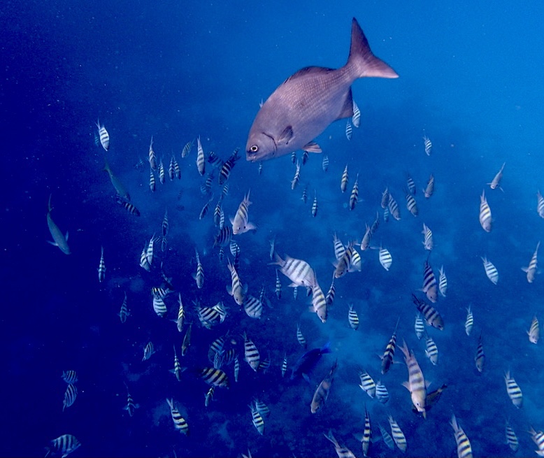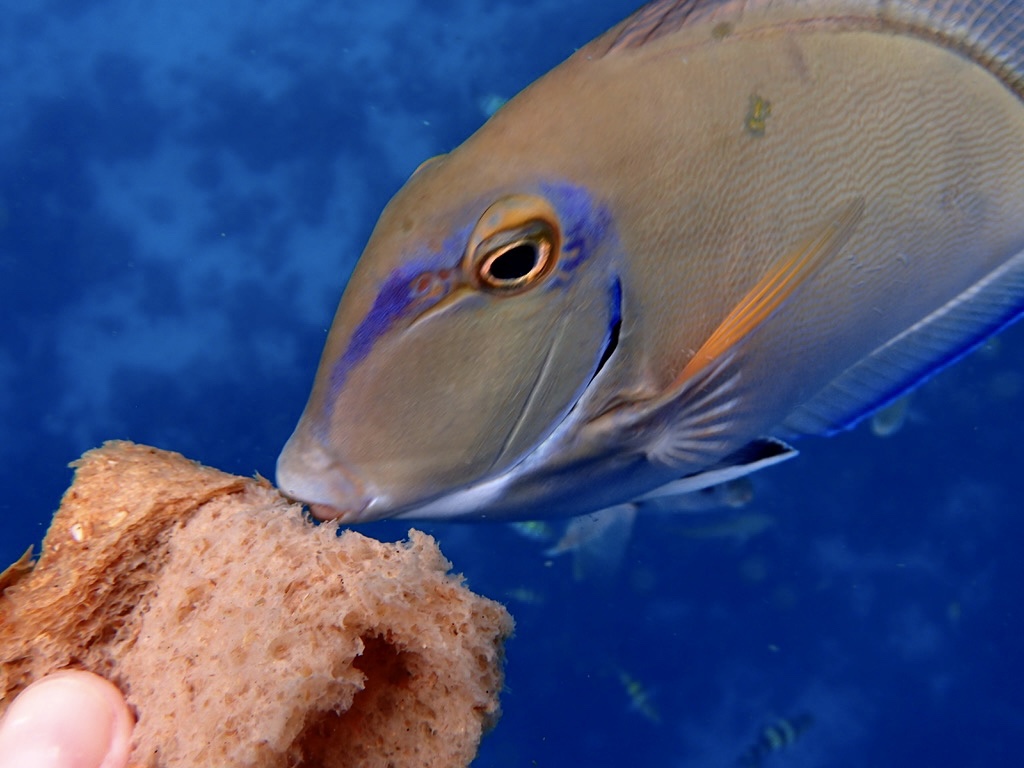 The normal crew: hanging under Quest we’ve got a pile of sergeant majors with yellow and white stripes. They are fast and quite pretty. We also have a family of French angelfish: a husband with two smaller wives I think. This is because the big one always seems so proud of itself. Then there’s a couple of small, cute fish. The surgeonfish for example. It comes out and eats so gently out of my hand. I guess that explains the name. Precise little nibbles.