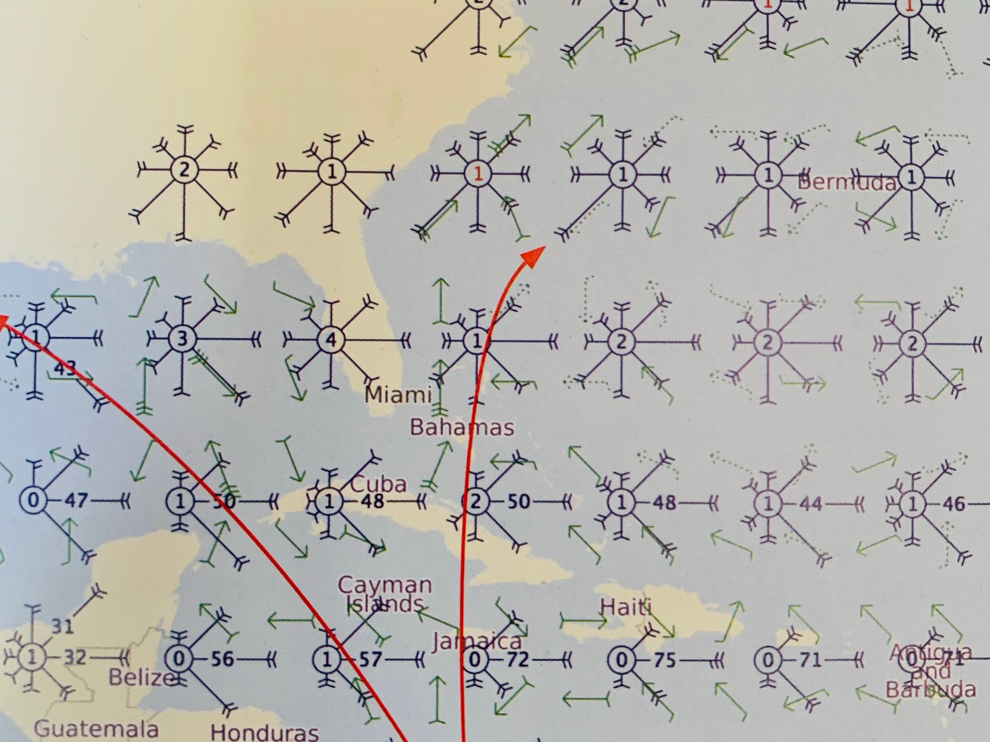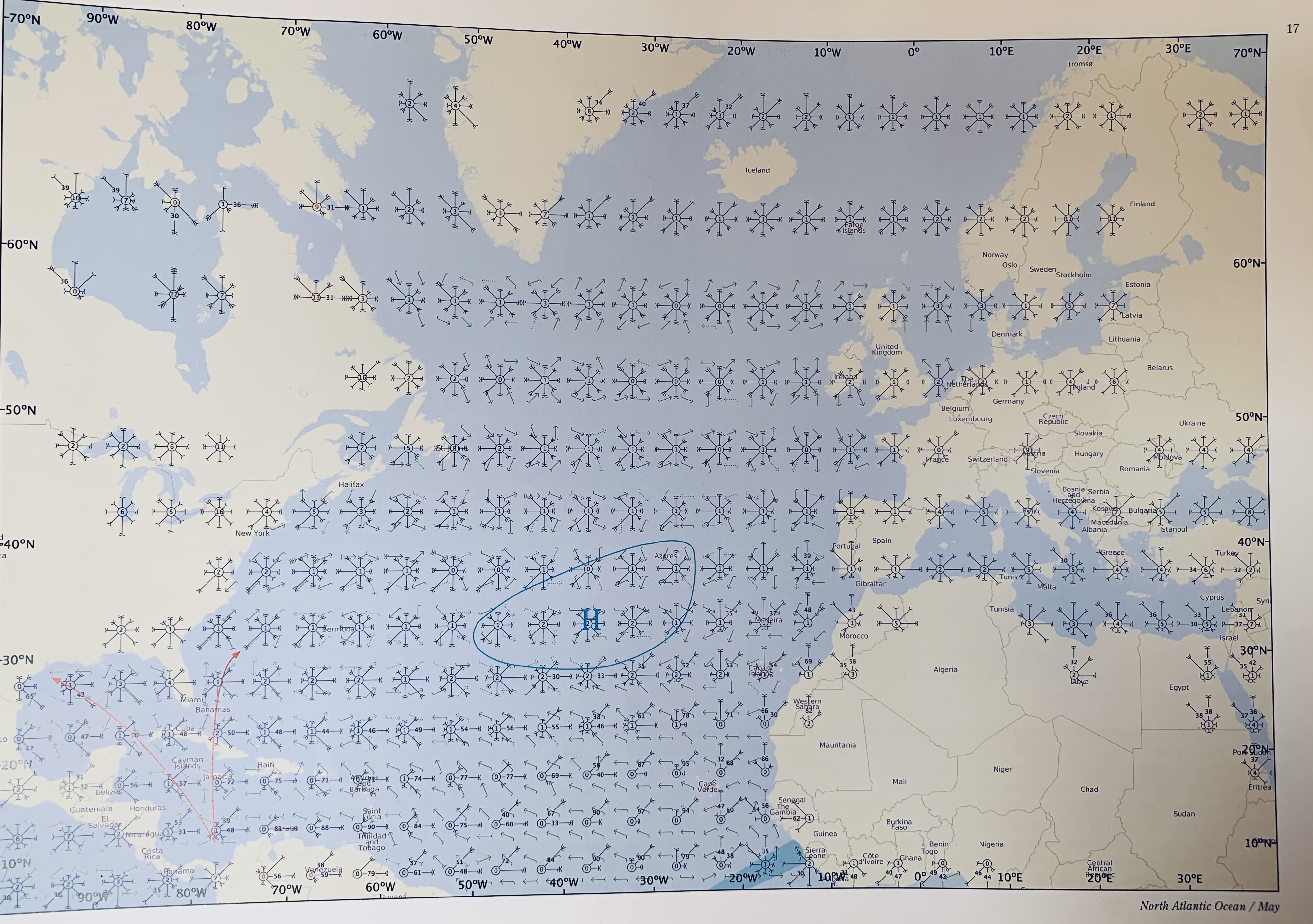 So this is where we stare – at the weather charts. There was a period of calmer weather last week. It turned out to be a nice window. We heard that some boats on other islands have used it to leave already for Horta. They rode the lighter conditions north and east. They’re now sailing a lovely breeze up towards Bermuda. Jack and I clocked their positions on the chart. The weather charts.