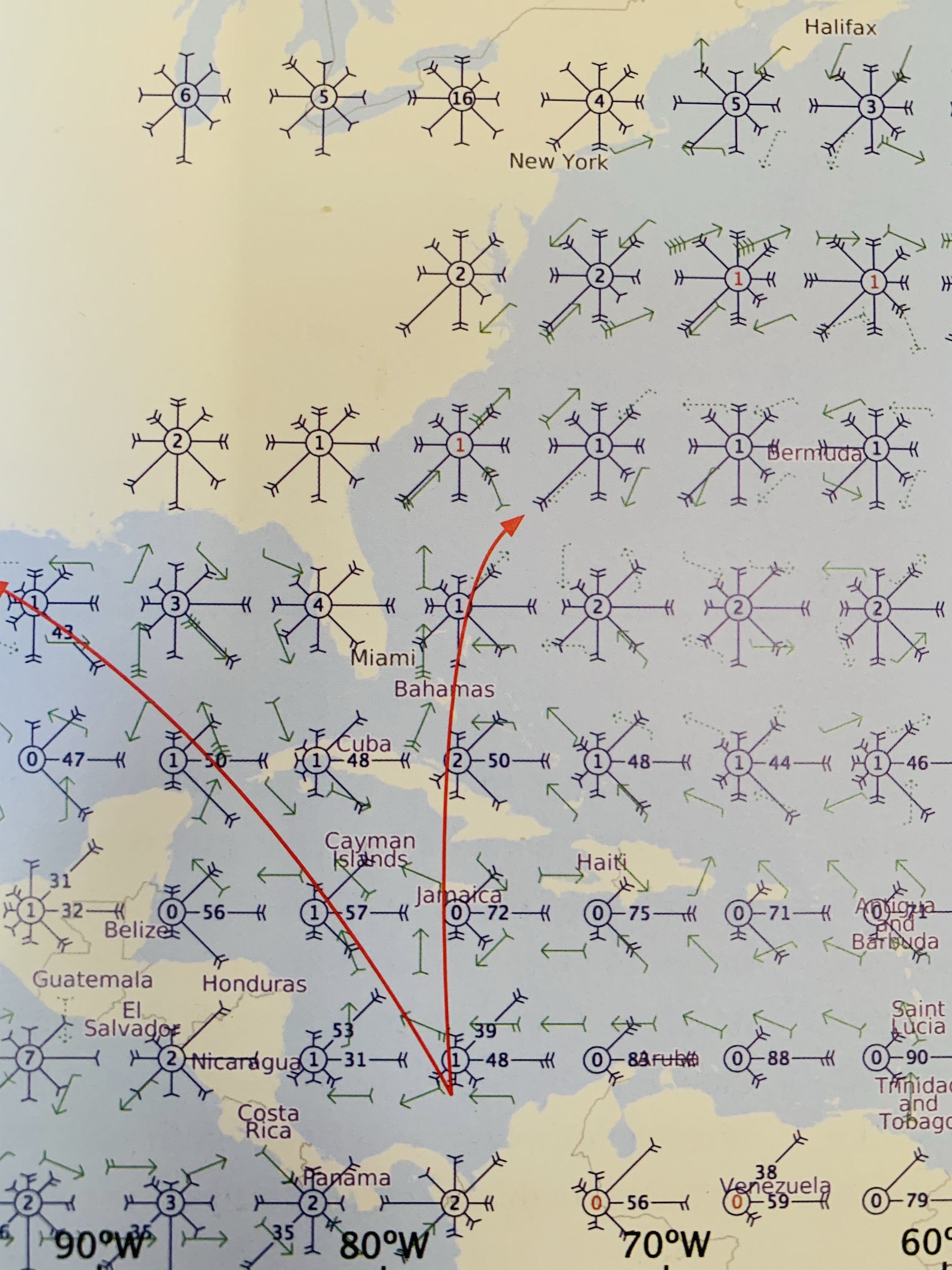 Herein lies our dilemma. Do we punch our way north out of our southern position in the Caribbean Sea – where the wind often funnels through this southerly corridor? Punch our way out of here – up to the northern part of the Caribbean Sea, where conditions are calmer?