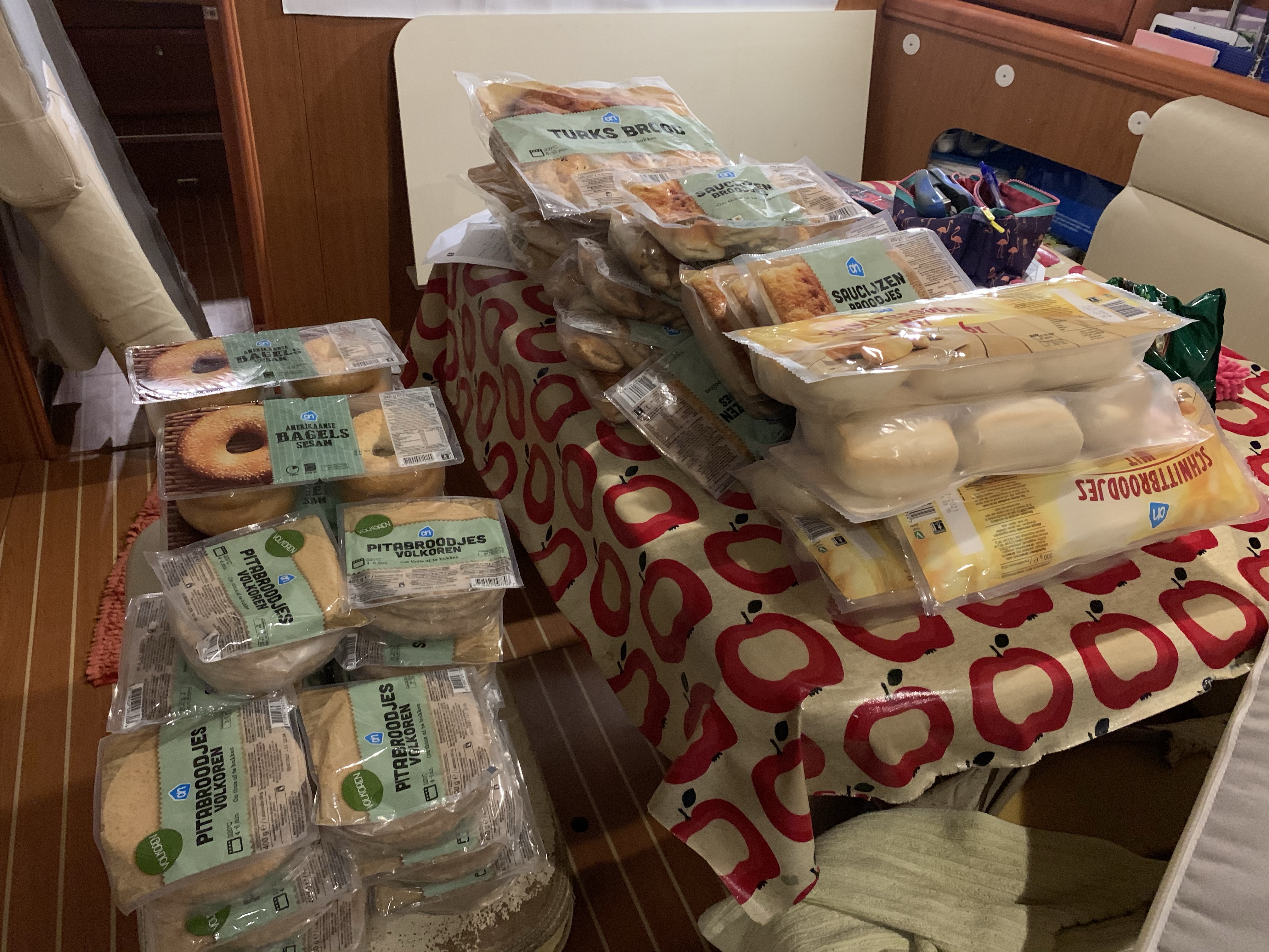 Indeed, there had been a delivery of part-baked bread. Hooray! The supermarket was only open for another hour, so I grabbed a trolley. I started to fill the trolley with the packs of part-baked. Only my stomach began to sink. I felt the physicality of what I was doing. I was taking a significant amount of the newly-arrived, part-baked bread. Not very cool. I mean, yes, we were going on a long crossing and bagels for breakfast and pitta breads to dip into pea soup would be nice.